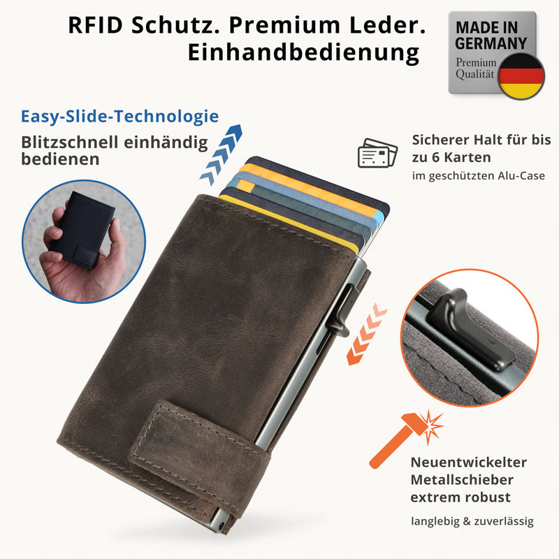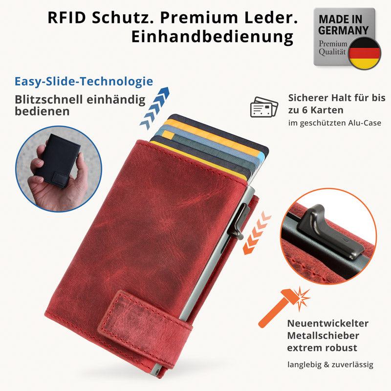 Dank der cleveren Easy-Slide-Schiebemechanik hast du alle Karten mit nur einem Handgriff griffbereit. So vereint SecWal maximale Sicherheit mit höchstem Bedienkomfort – kompakt, durchdacht und stilvoll.